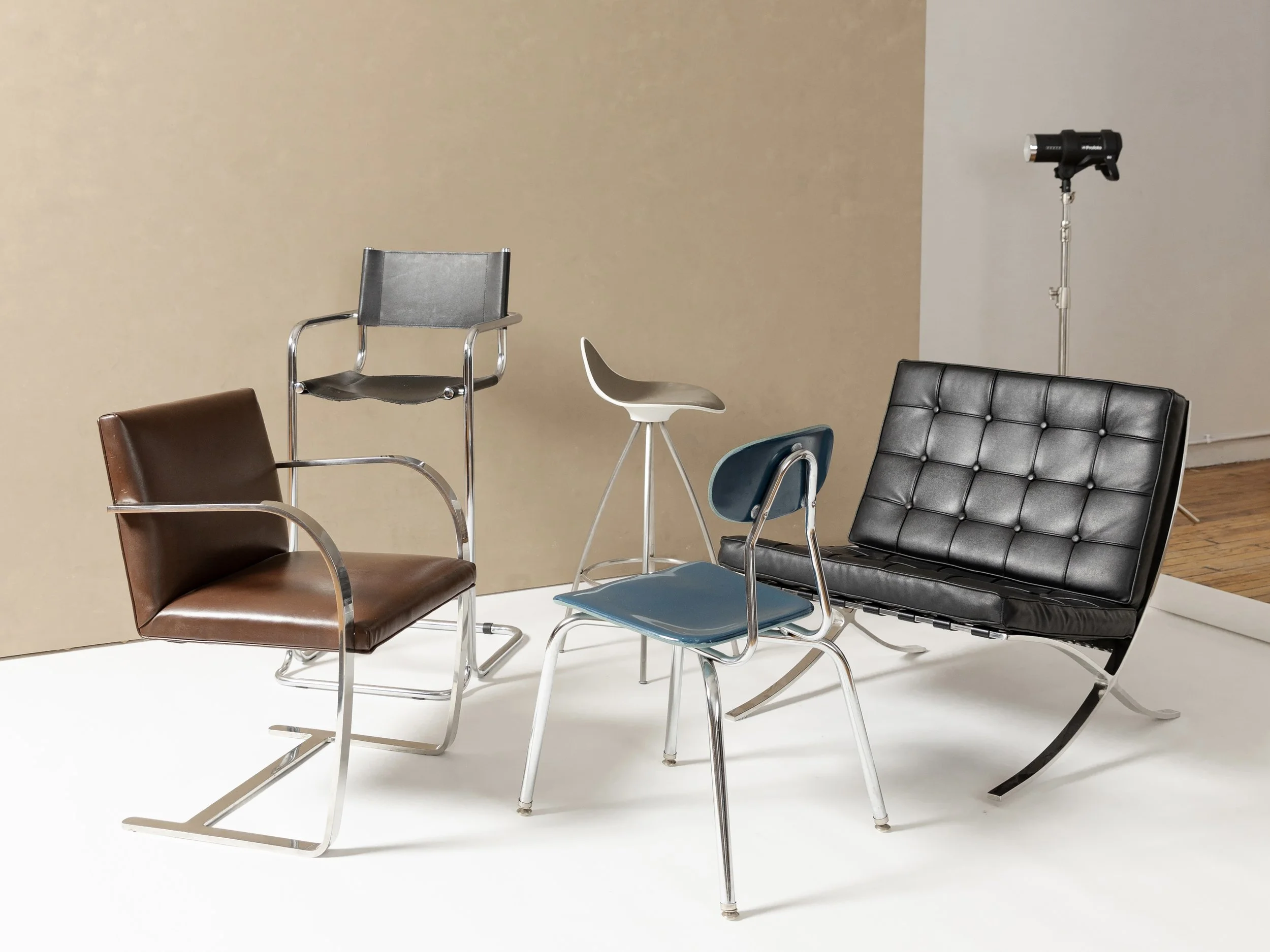 A multilevel production studio with artistic backdrops, curated furniture, and professional equipment.